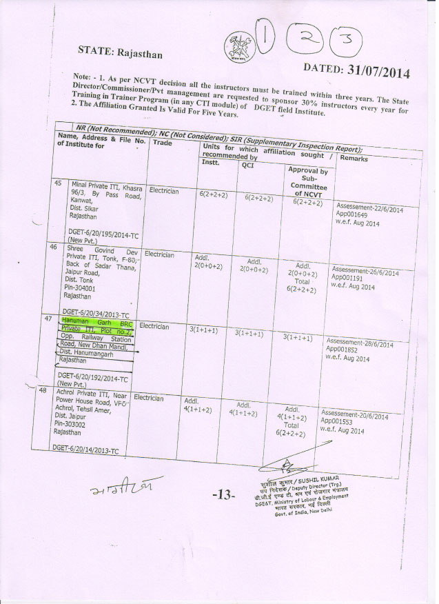 | Name of the Institute | Hanumangarh BRC PVT. ITI, Hanumangarh |